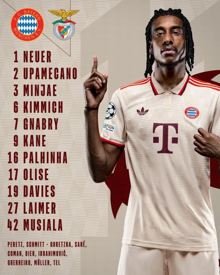 拜仁官方随后确认,乌尔赖希因身体不适未进入对阵本菲卡的比赛大名单。