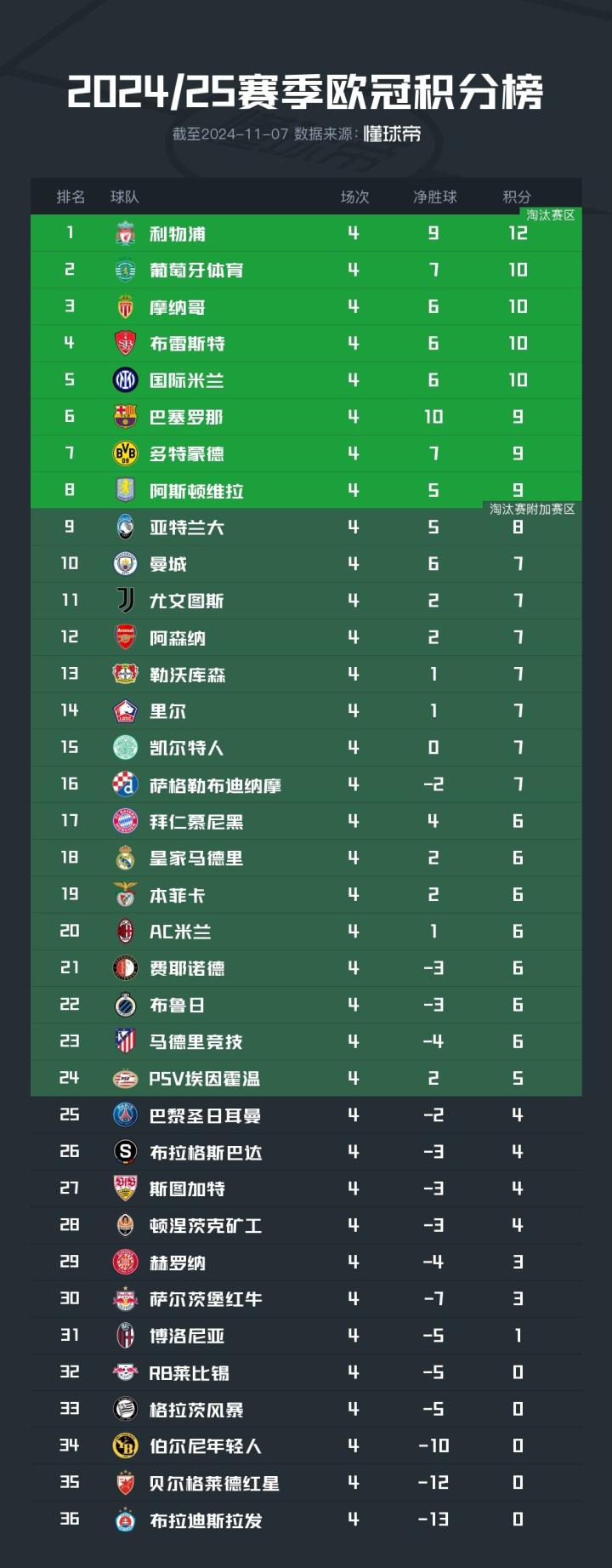 北京时间11月7日,欧冠联赛阶段结束了第4轮的全部交流,积分榜的形势也产生了新的变化。