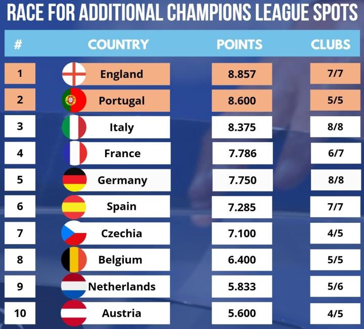 欧冠联赛阶段第四轮的比赛已经全部结束,各联赛竞争下赛季欧冠额外参赛资格的积分榜也随之更新,英超目前依然排名第一,葡超第二,意甲排名第三。