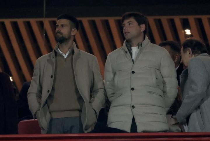 在巴塞罗那对阵贝尔格莱德红星的欧冠比赛中,网坛巨星德约科维奇在现场观战。
