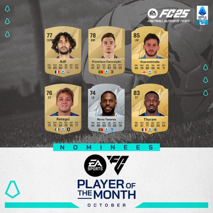意甲官方公布了10月最佳球员的6位候选者,马库斯-图拉姆、克瓦拉茨赫利亚、雷特吉、弗朗西斯科-孔塞桑、阿德利以及努诺-塔瓦雷斯入选。