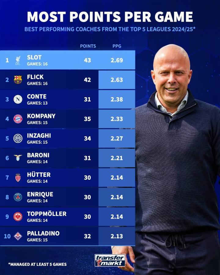 德国转会市场网站列出了本赛季五大联赛球队主帅各项赛事场均积分排行,利物浦主帅斯洛特以2.69分居首,弗里克第二,孔蒂第三。