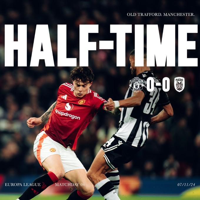欧联杯联赛阶段第4轮,曼联主场对阵希腊球队塞萨洛尼基,上半场战罢,比分为0-0,控球率六四开,曼联4次射门1次射正,塞萨洛尼基5次射门2次射正。