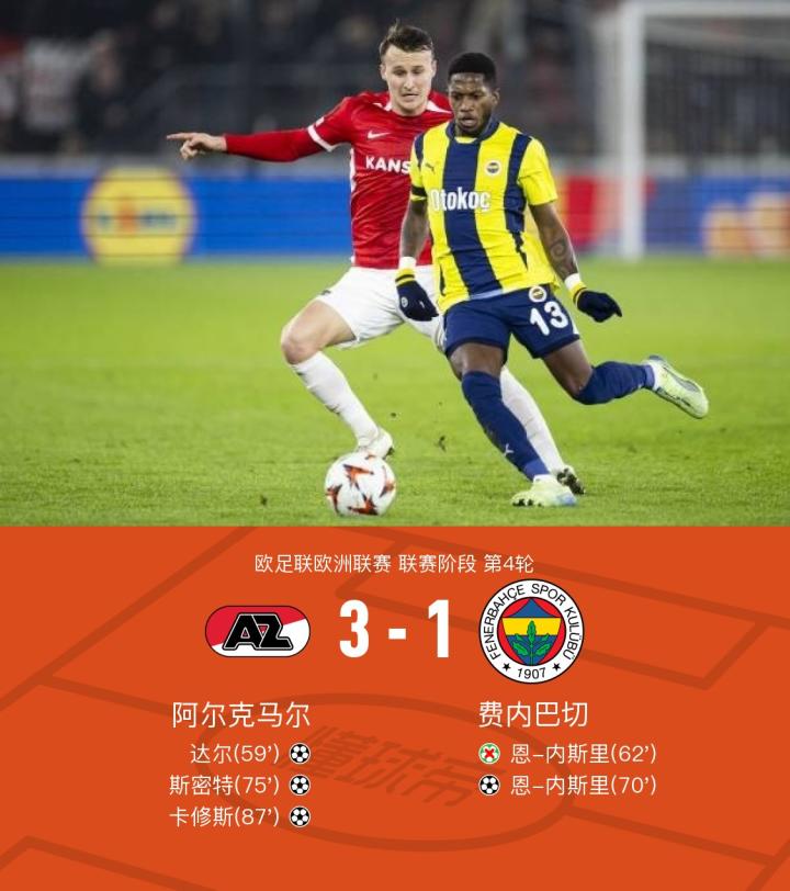 阿尔克马尔3-1费内巴切,恩-内斯里破门+丢点,达尔建功