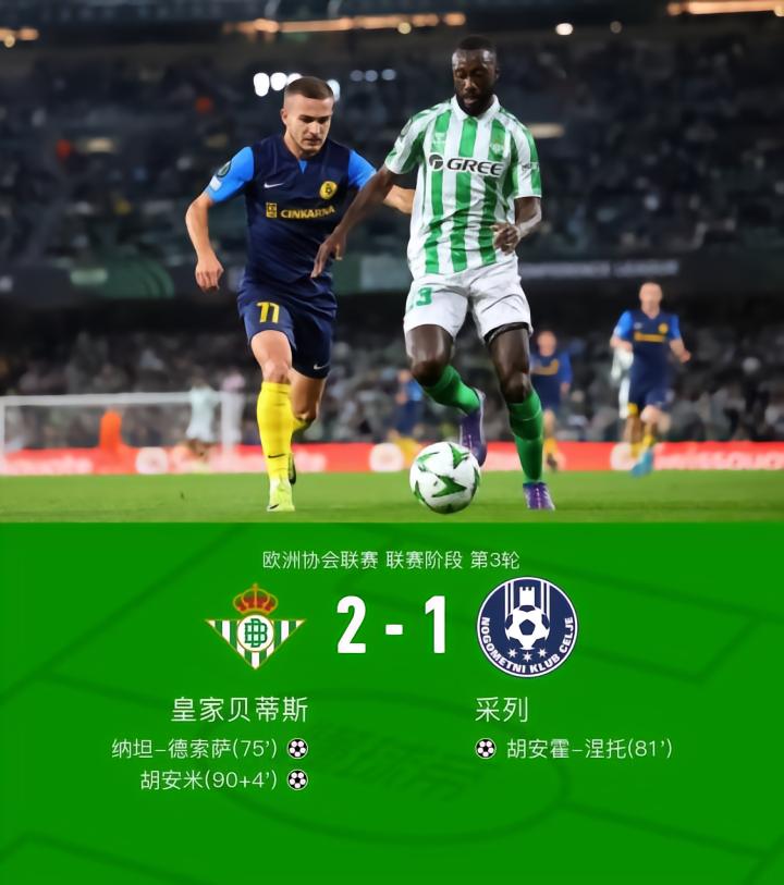 皇家贝蒂斯2-1采列,纳坦-德索萨破门,胡安米补时绝杀