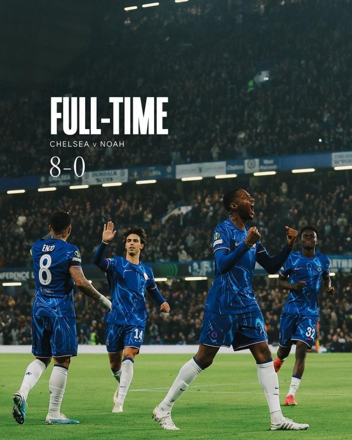 欧协联联赛阶段第3轮,切尔西主场8-0大胜诺亚,追平了队史第二大分差胜利纪录。
