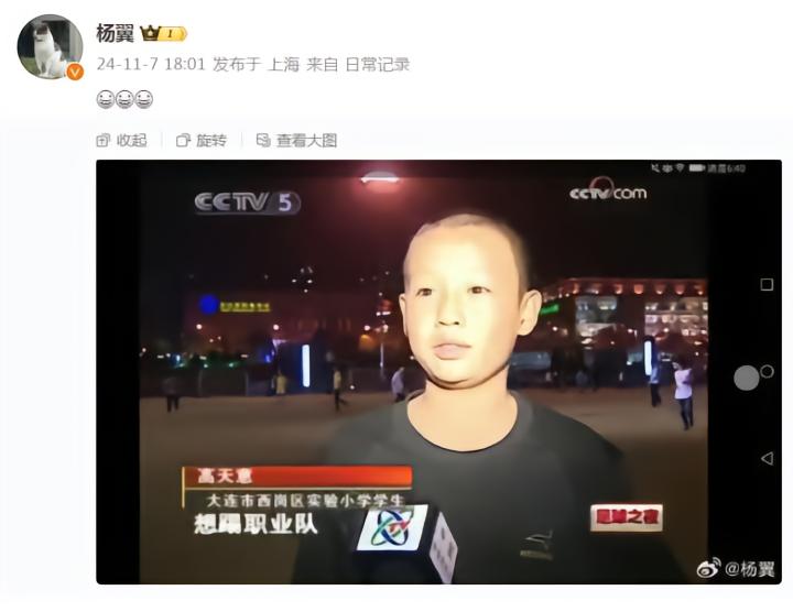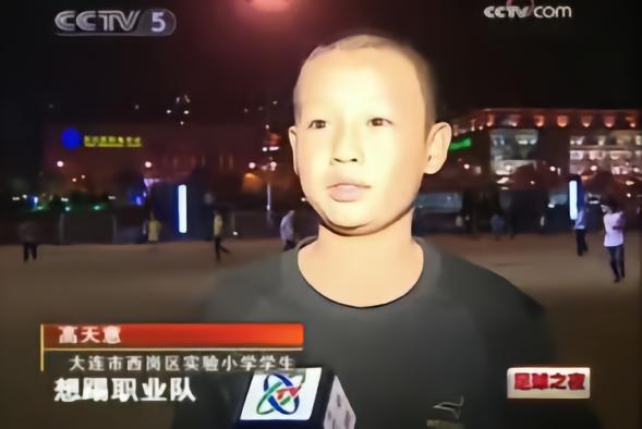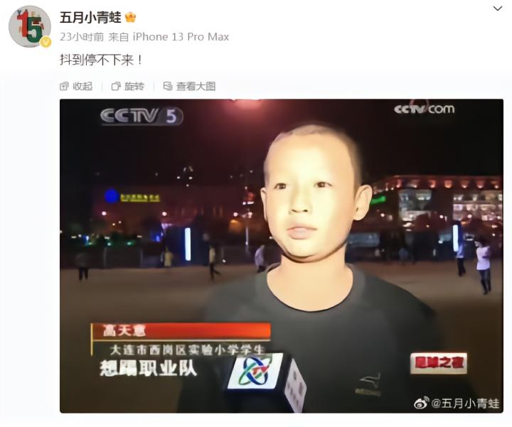 博主“五月小青蛙”和五星体育记者杨翼都在微博里晒出了高天意的这张采访截图。在《足球之夜》节目中,当时身为大连市西岗区实验小学学生的高天意表示:“想踢职业队。”