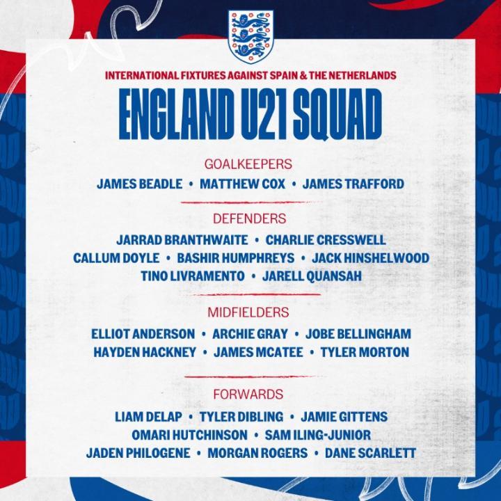 英格兰U21代表队公布了他们新一期的大名单,布兰斯韦特、夸安萨、乔布-贝林厄姆、阿奇-格雷、詹姆斯-麦卡蒂、莫顿、比诺埃-吉滕斯、伊林、摩根-罗杰斯入选。