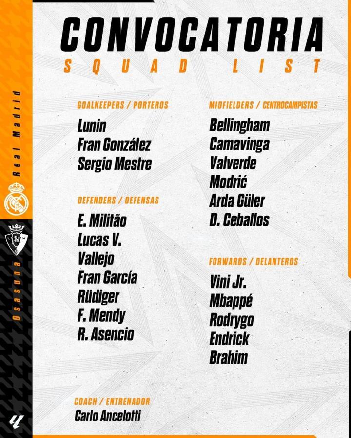 皇家马德里官方公布了西甲第13轮主场对阵奥萨苏纳的比赛大名单,姆巴佩领衔,巴尔韦德在列,楚阿梅尼伤缺,比赛将于北京时间11月9日21:00进行。