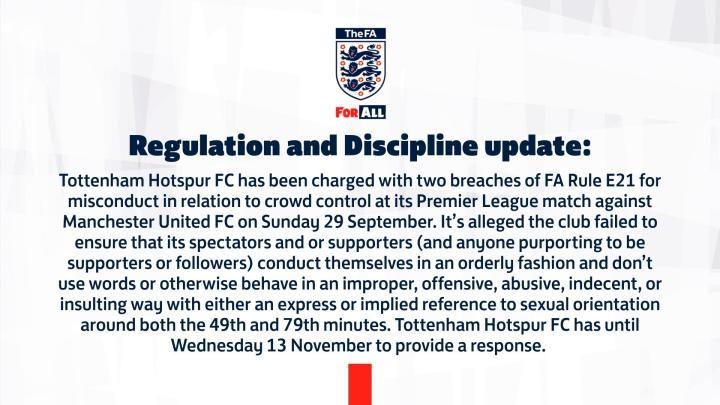 指控称,俱乐部未能确保其观众或球迷(以及任何自称为球迷或支持者的人)以有序的方式行事,并且未能防止他们在第49分钟和第79分钟时使用言语或其他方式做出不当、冒犯、辱骂、不雅或侮辱性的行为,尤其是涉及性取向的明示或暗示内容。托特纳姆热刺足球俱乐部需在11月13日星期三之前作出回应。