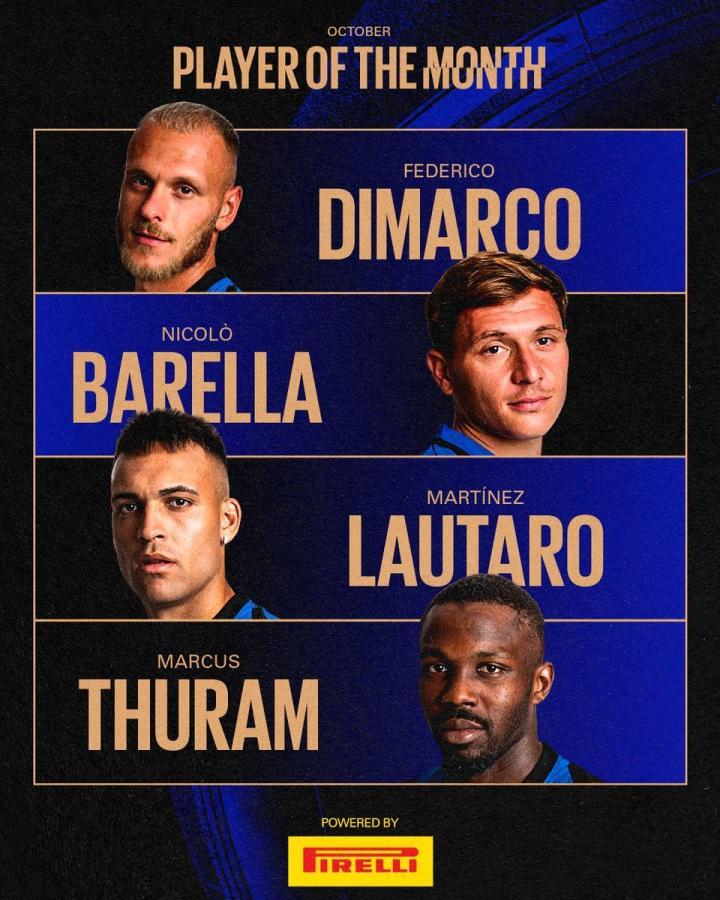 国际米兰官方公布了队内10月最佳球员候选名单,分别是劳塔罗-马丁内斯、马库斯-图拉姆、迪马尔科和巴雷拉。