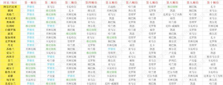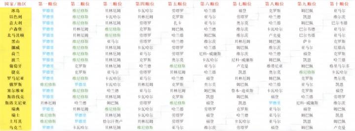 阿尔巴尼亚、德国、英格兰、亚美尼亚、奥地利、比利时、白俄罗斯、波黑、保加利亚、克罗地亚、丹麦、苏格兰、爱尔兰、西班牙、芬兰、法国、威尔士、格鲁吉亚、希腊、匈牙利、北爱尔兰、冰岛、以色列、意大利、卢森堡、北马其顿、黑山、挪威、荷兰、波兰、葡萄牙、捷克、罗马尼亚、俄罗斯、塞尔维亚、斯洛伐克、斯洛文尼亚、瑞典、瑞士、土耳其、乌克兰。