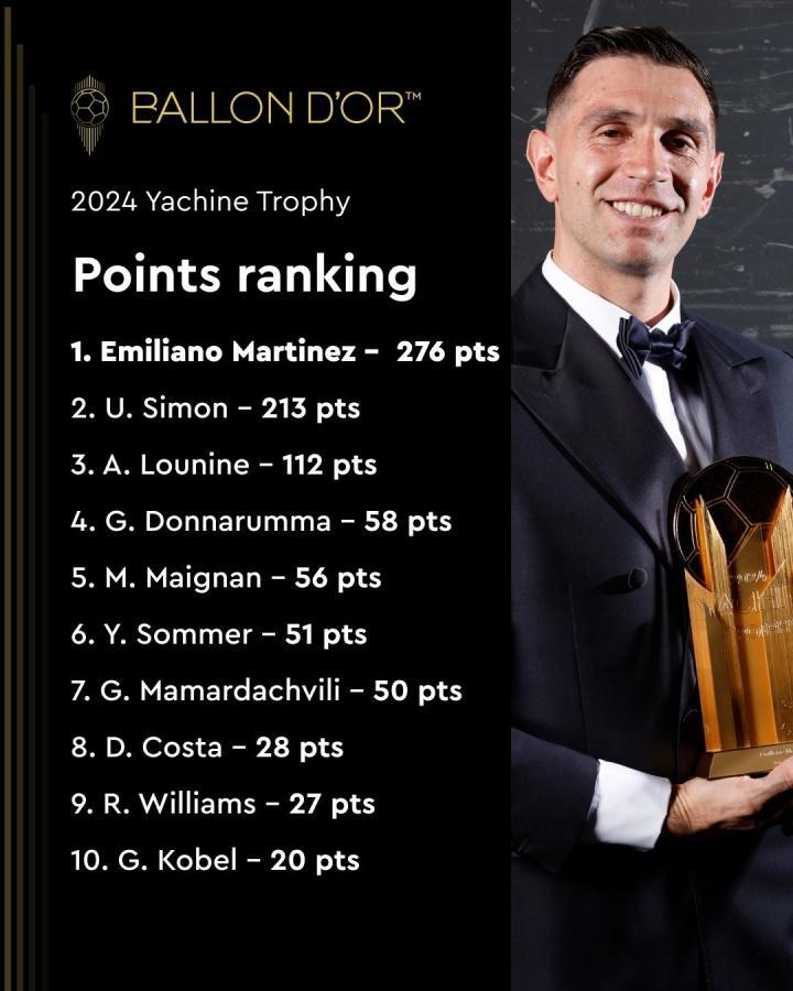 金球奖公布了2024雅辛奖评选前10名的投票得分细节,达米安-马丁内斯最终以276分,领先第二名乌奈-西蒙63分赢得了这一奖项。