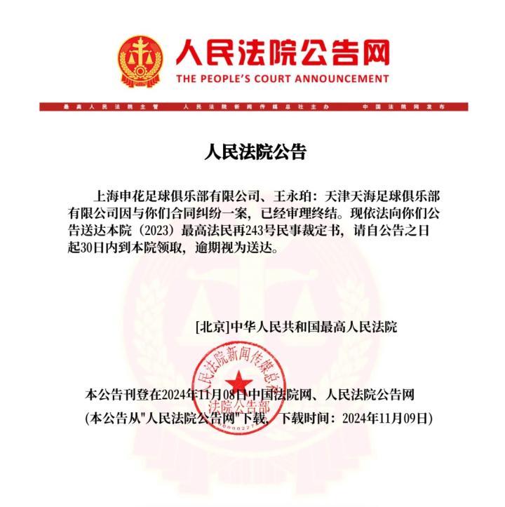 人民法院公告显示,有关上海申花、王永珀与天津天海的合同纠纷案件已经审理终结。