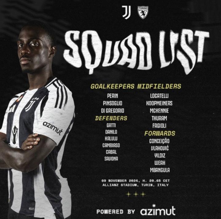 北京时间11月10日凌晨3:45分,意甲第12轮,尤文将在主场迎战都灵。赛前,尤文图斯官方公布了本场比赛的大名单。