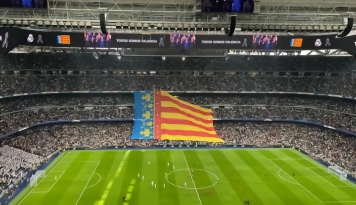 正如在与米兰的欧冠比赛中一样,皇马球迷在伯纳乌体育场西侧挂起了一面巨大的瓦伦西亚自治区旗帜,正好悬挂在教练区前面,球员们从那里走向球场。