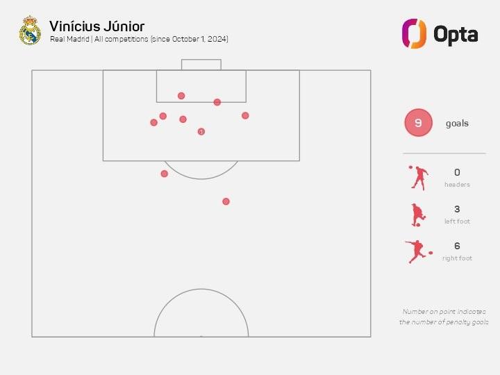 此役主场对阵奥萨苏纳打入3球后,自10月份以来,维尼修斯在各项赛事已代表皇马打入9球,其中欧冠打入4球,西甲打入5球,左脚打入3球,右脚打入6球。