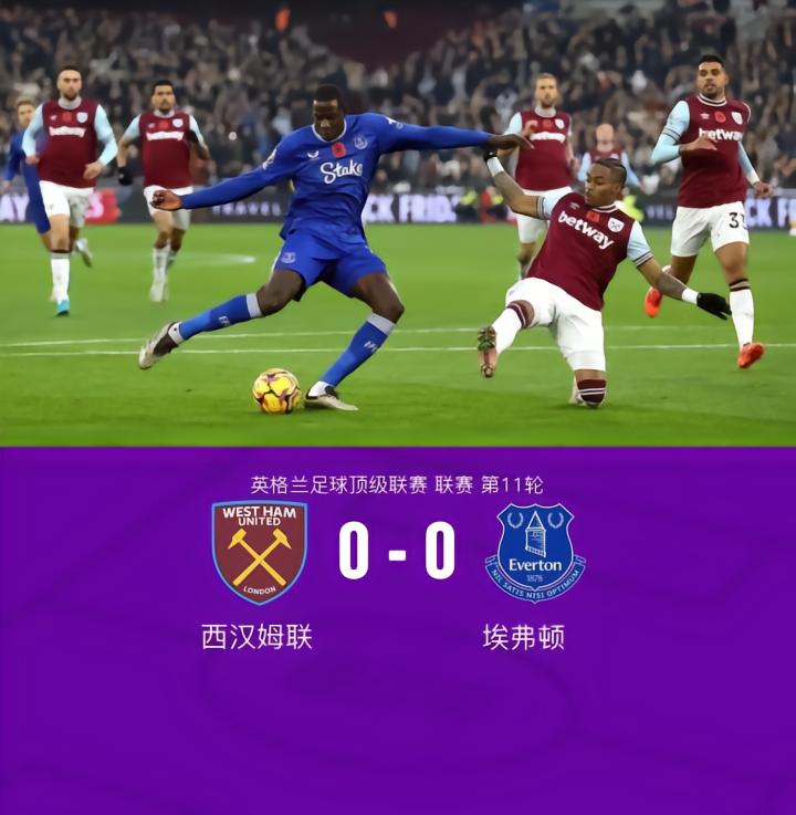 西汉姆联0-0埃弗顿,萨默维尔射门中框,皮克福德终场前神扑