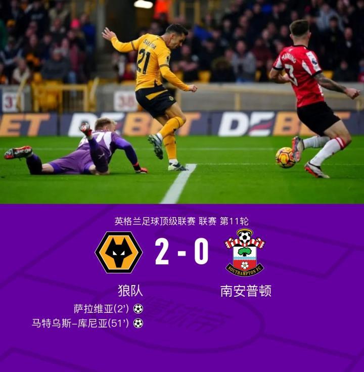 狼队2-0南安普顿,马特乌斯-库尼亚传射,萨拉维亚闪击
