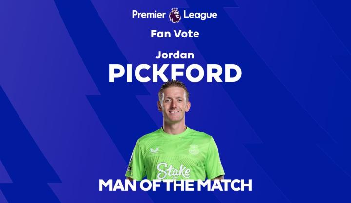 在英超第11轮的比赛中,埃弗顿在客场0-0与西汉姆联互交白卷,赛后此战最后时刻奉献神扑的皮克福德被球迷投票选为了本场比赛英超官方的最佳球员。
