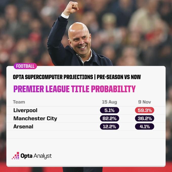 Opta预测的本赛季英超夺冠概率方面,利物浦达到59.3%,本赛季首次超越曼城,后者夺冠概率降至36.2%,阿森纳的夺冠概率为4.1%。