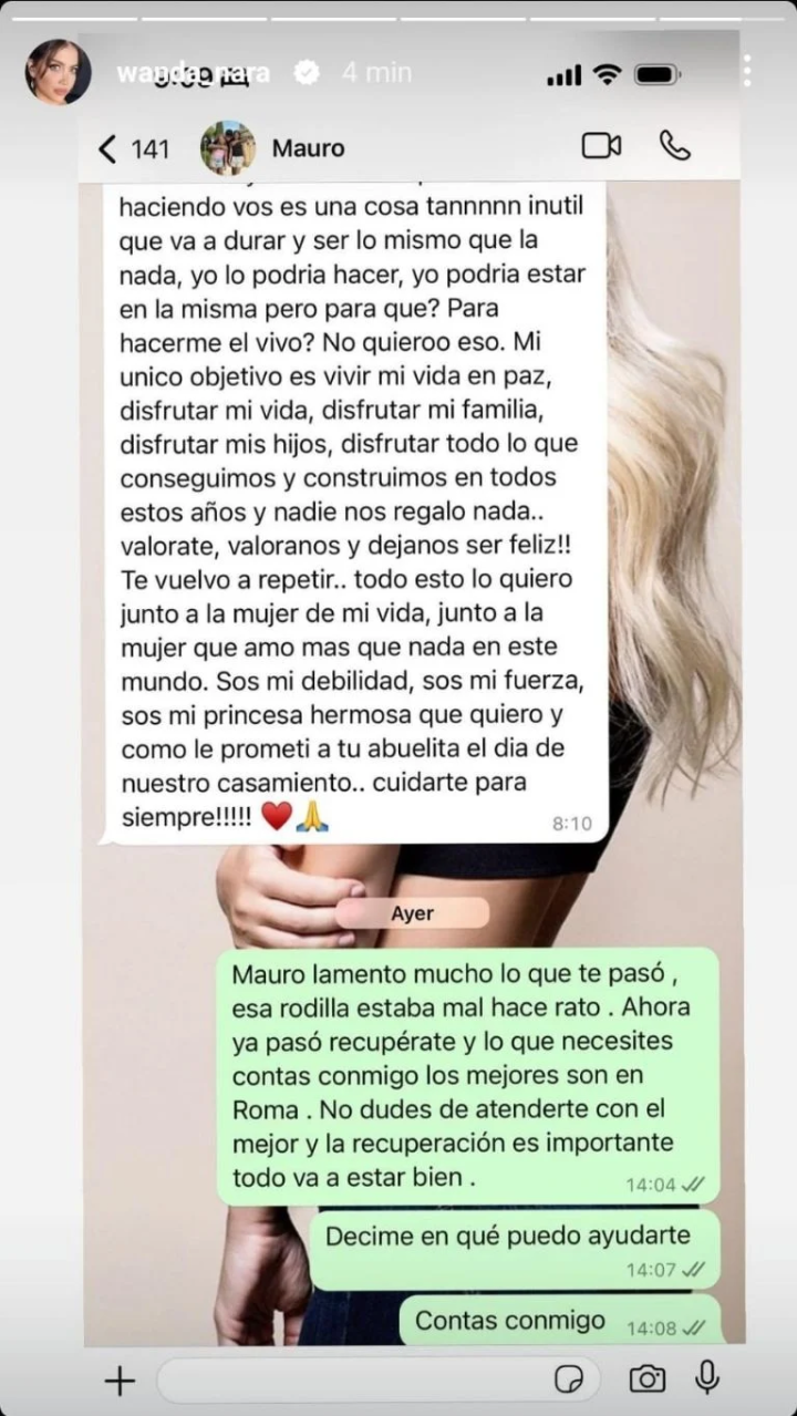 而旺达则回复道:“毛罗(伊卡尔迪),我为你的遭遇感到遗憾,你的膝盖在很久之前就有伤了。现在一切都告一段落了,你可以好好休息、享受任何你需要的东西,你可以依靠我。最好的医疗条件在罗马,别犹豫,你需要最好的医疗。你的康复非常重要,一切都会变好的。”