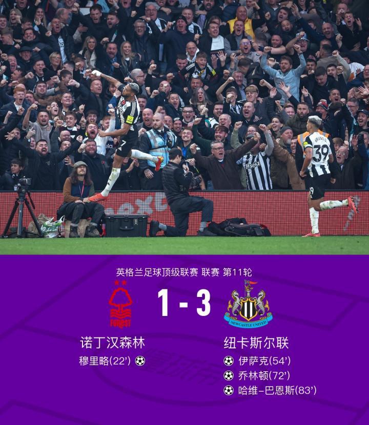 纽卡3-1逆转森林,伊萨克传射,乔林顿破门,托纳利送助攻