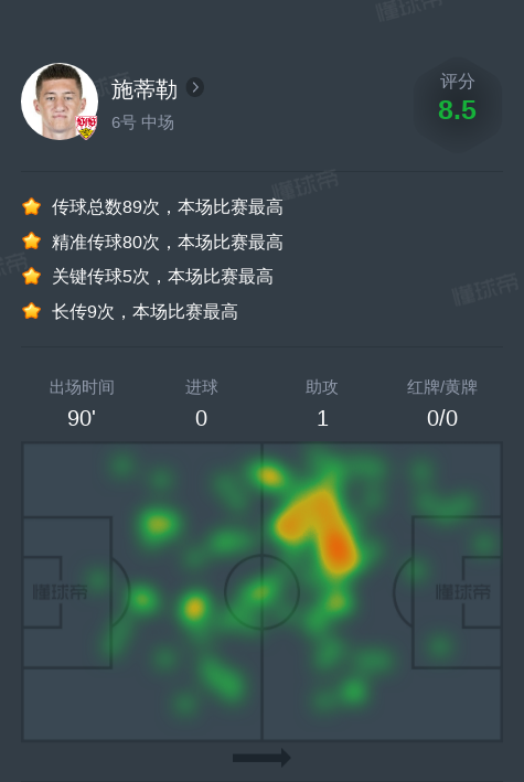 北京时间11月11日斯图加特vs法兰克福,施蒂勒1助攻,5次关键传球。
