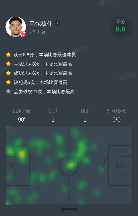 北京时间11月11日斯图加特vs法兰克福,马尔穆什贡献1球,1助攻,1次关键传球,4次射门,6次成功过人。
