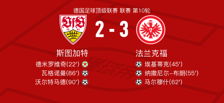 北京时间11月11日斯图加特vs法兰克福,马尔穆什得到全场最高的8.8分,德米罗维奇得到全场最低的5.7分