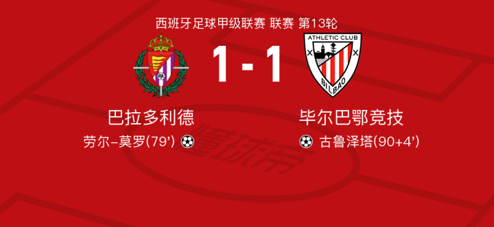 北京时间11月11日巴拉多利德vs毕尔巴鄂竞技,德加拉雷塔得到全场最高的7.6分,居马尔特得到全场最低的6.1分