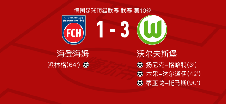 北京时间11月11日海登海姆vs沃尔夫斯堡,瓦夫罗得到全场最高的7.7分,凯文-穆勒得到全场最低的5.3分