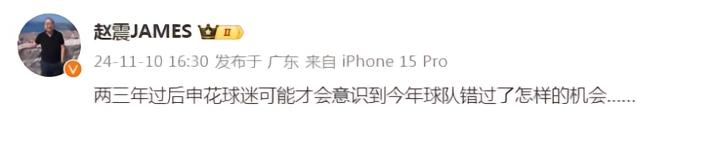 昨天,媒体人赵震在微博里表示:“两三年过后,申花球迷可能才会意识到今年球队错过了怎样的机会……”