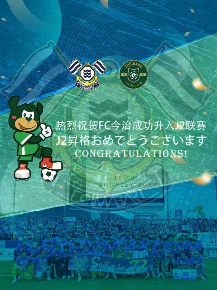 日本J3联赛的FC今治提前两轮升入了J2联赛,浙江队官方发文送祝福。