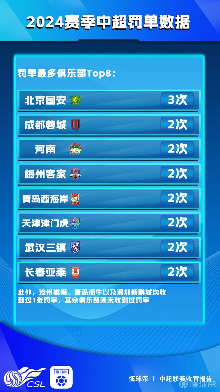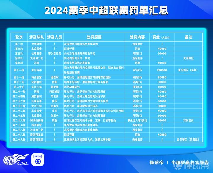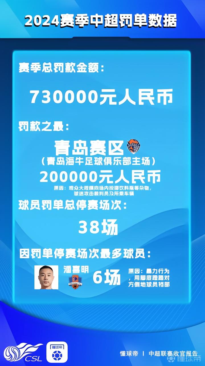 在赛季正式收官的时刻,懂球帝《2024赛季中超收官报告》也正式上线,今天我们将盘点本赛季中超联赛所有罚单的情况。