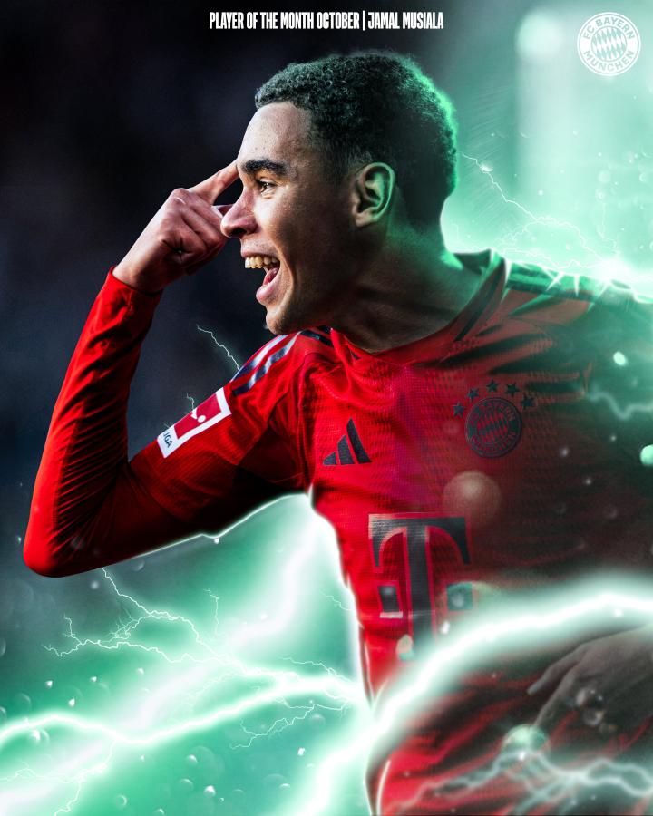 拜仁慕尼黑官方消息,球队中场穆西亚拉当选队内十月最佳球员。