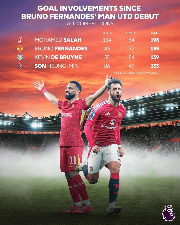 至此,布鲁诺-费尔南德斯曼联生涯各项赛事已打入83球,送出72次助攻,直接参与155球。