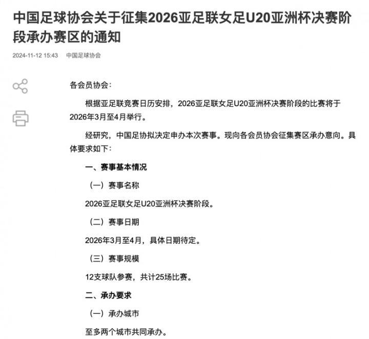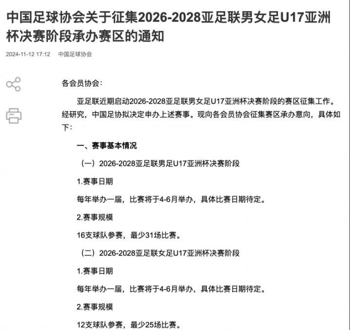 11月12日,中国足协通过官方渠道分别发布了“征集2026-2028亚足联男女足U17亚洲杯决赛阶段承办赛区”、以及“征集2026亚足联女足U20亚洲杯决赛阶段承办赛区”的通知,确认协会拟申办此几项赛事。