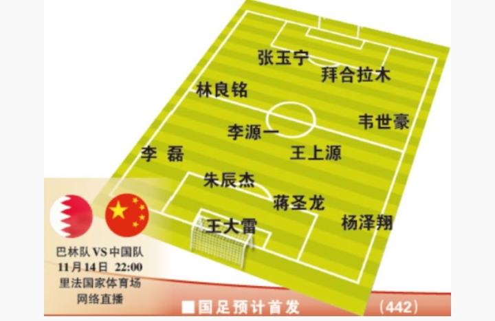 《东方体育日报》预测国足首发:王大雷;杨泽翔、蒋圣龙、朱辰杰、李磊;王上源、李源一、韦世豪、林良铭;拜合拉木、张玉宁。