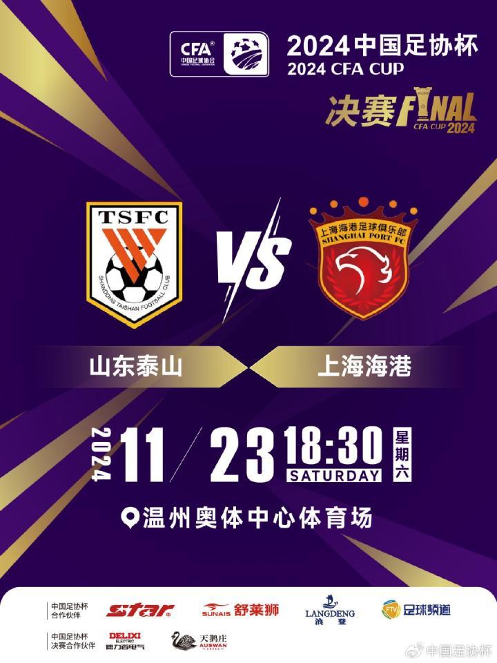 2024中国足协杯巅峰对决一触即发,山东泰山与上海海港队将于11月23日在浙江温州奥体中心体育场展开较量。据中国足协杯官方消息,足协杯决赛将于本周五11月15日15:00正式开始售票。本次门票价格最贵为A档380元,最便宜的为C档180元。