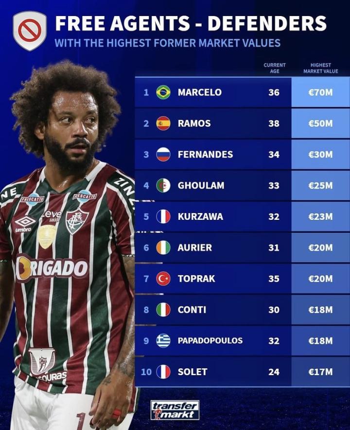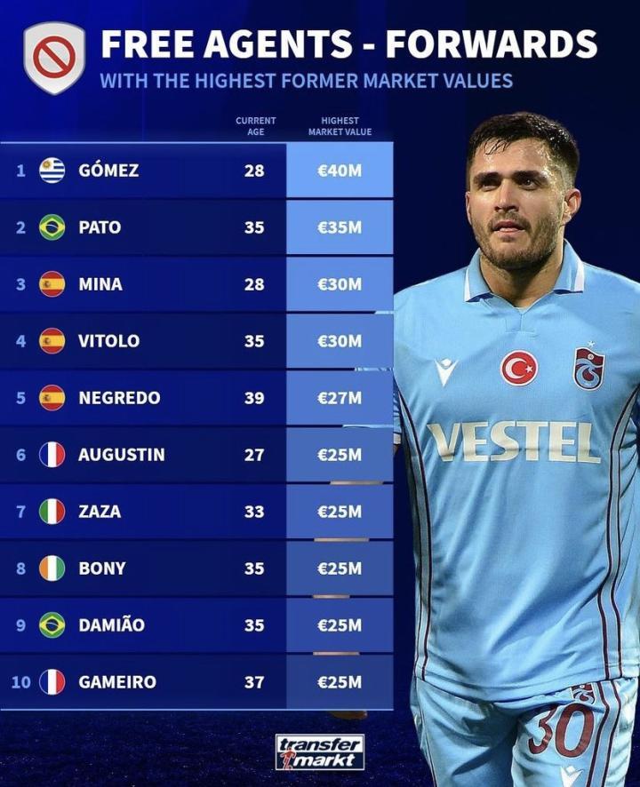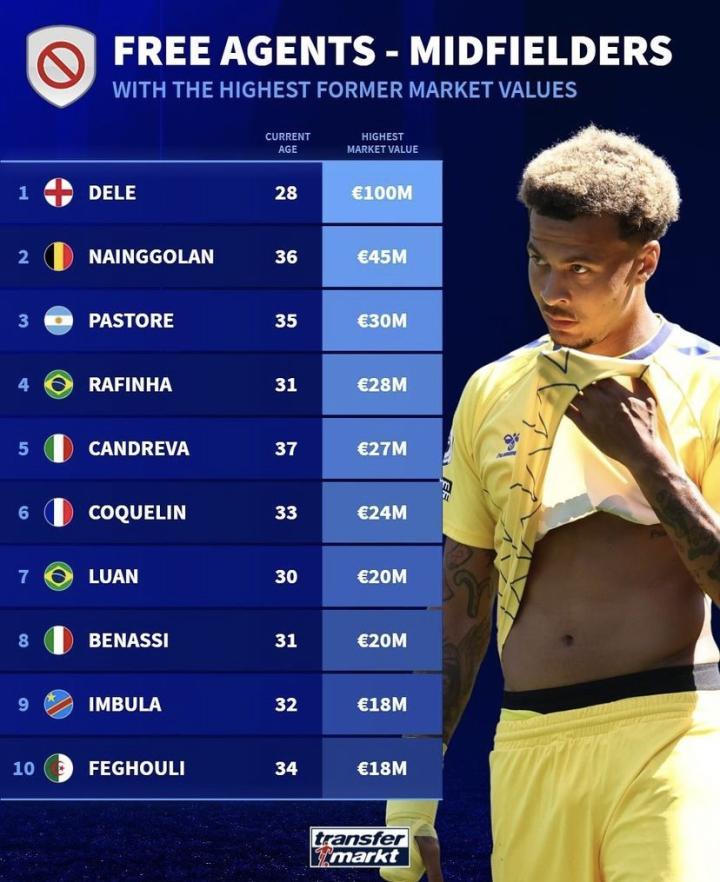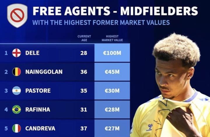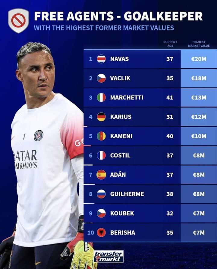 德转盘点出了门将、后卫、中场以及前锋四个位置上目前知名的自由球员,其中包括了凯洛尔-纳瓦斯、马塞洛、拉莫斯、纳因戈兰、坎德雷瓦、帕托这样的老将,也包括了身价曾经达到1亿欧元的阿里。