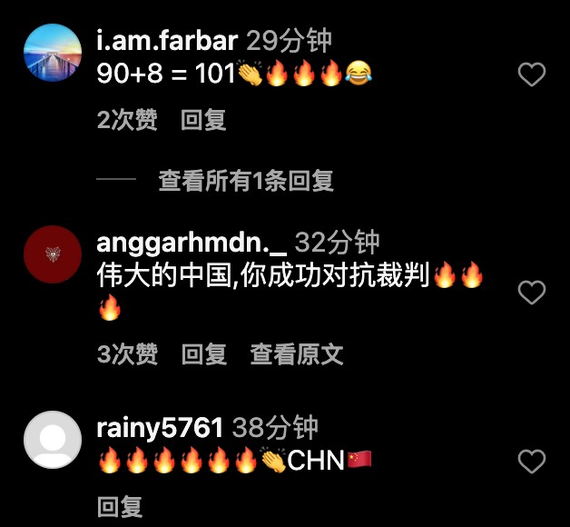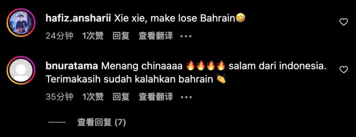 也有不少印尼球迷直接开始嘲讽巴林队,“这回没有了裁判的帮助,你们还能做什么呢?” “90+8=101?😂(嘲讽巴林队此前的超长补时)” “中国队,你们是真正的英雄,你们不但战胜了巴林,还战胜了裁判。”