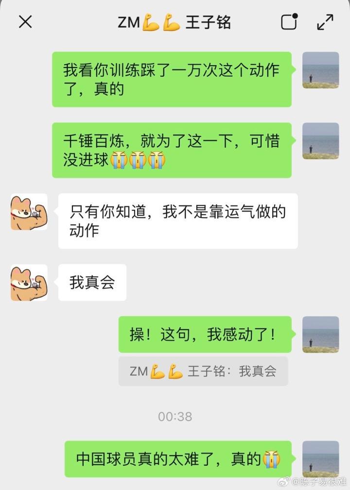 国安俱乐部新闻官陈子楠在赛后晒出了自己和王子铭的聊天记录,并谈到了这次踩单车突破:“这几年训练中看过子铭无数次做这个动作,节奏频率都一样。这几年我觉得有80%的时间里子铭背负了很大的压力,今天很高兴在这场压力这么大的比赛里看到他这么自如的发挥。我证明,他真会!”