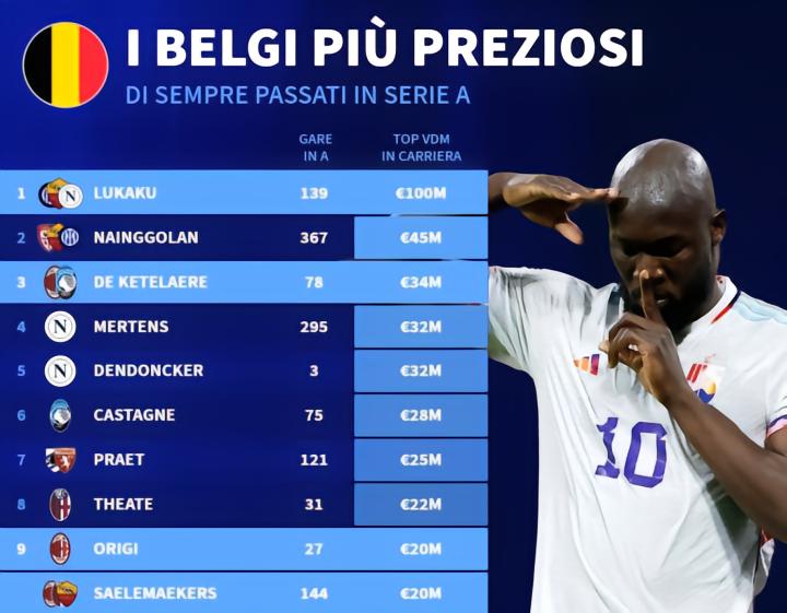 北京时间周五凌晨03:45,比利时将会在欧国联A级第五轮的比赛中坐镇主场迎战意大利,赛前德转则统计出效力意甲身价最高的10名比利时球员,卢卡库高居第一。