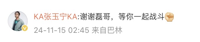 随后,张玉宁在评论区留言感谢:“谢谢磊哥,等你一起战斗。”