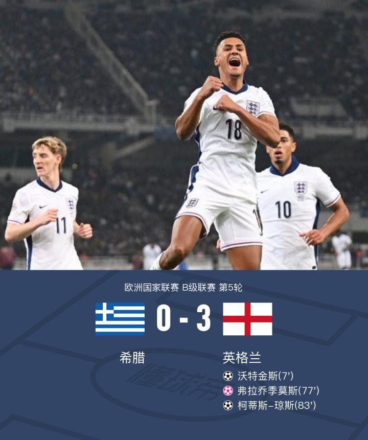 英格兰3-0复仇希腊,贝林厄姆造乌龙+中柱,琼斯脚后跟破门