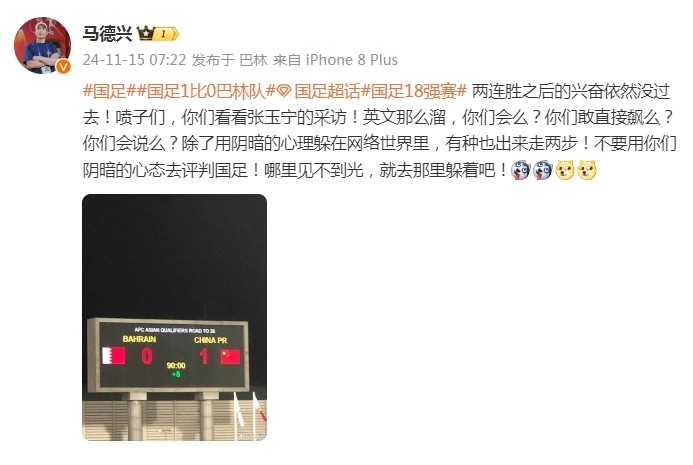 世预赛18强赛第5轮,国足凭借张玉宁的绝杀客场1-0击败巴林队。《体坛周报》记者马德兴在微博发文回击了网络喷子:“张玉宁采访英文那么溜,你们会说么?除了用阴暗的心理躲在网络世界里,有种也出来走两步!不要用你们阴暗的心态去评判国足!”