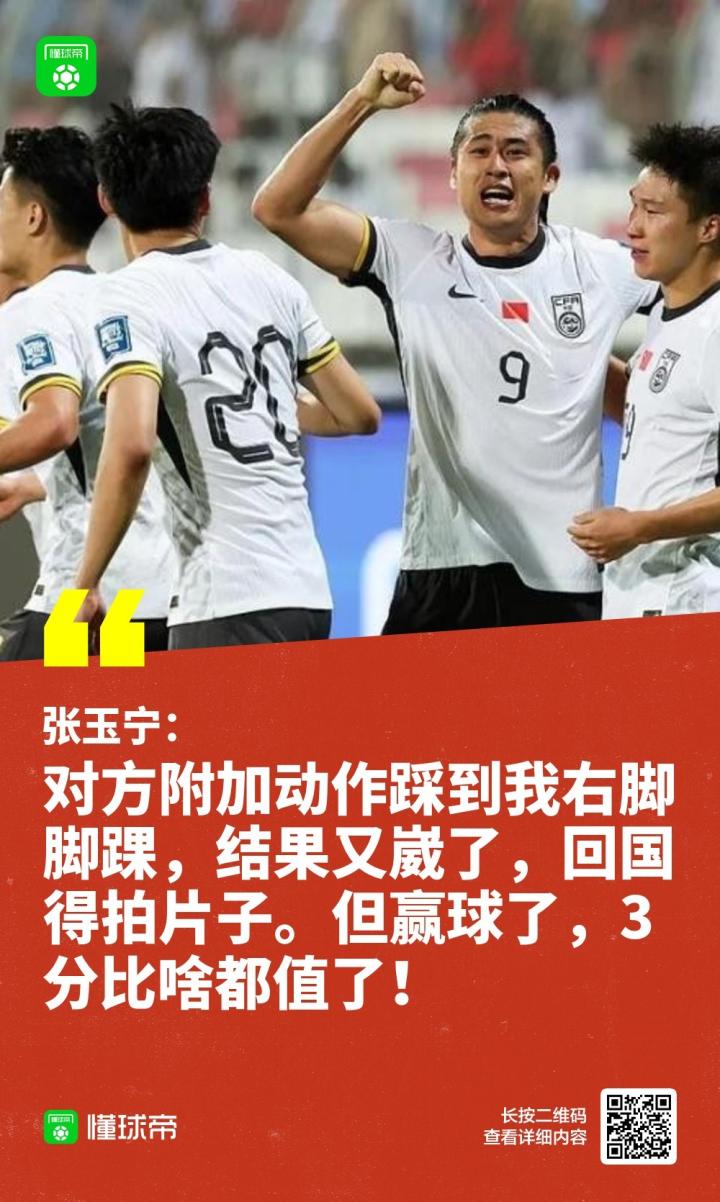 来自《北京青年报》记者@肖赧 的消息表示,国足客场1-0击败巴林队的比赛结束后,张玉宁一瘸一拐地离开比赛场地。随后在接到父亲张全成的电话时,张玉宁说:“对方附加动作踩到我右脚脚踝,结果又崴了,回国得拍片子。但赢球了,3分比啥都值了!”