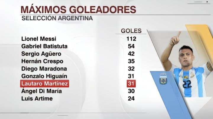 在阿根廷1-2不敌巴拉圭的比赛中,劳塔罗-马丁内斯帮助球队破门。他已经代表阿根廷国家队打入了31球,追平伊瓜因。阿根廷国家队队史射手榜,梅西以112球排名第一,遥遥领先其他球员。