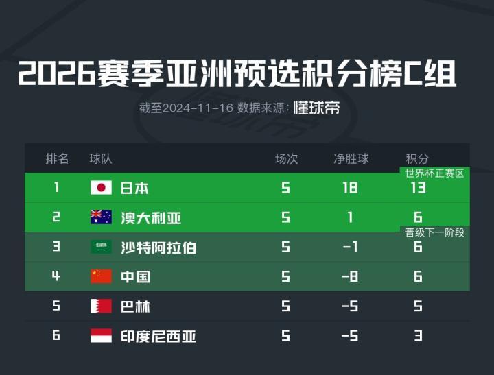 在第5轮客场击败巴林后,国足在18强赛上半程结束后取得2胜3负的成绩,积6分排名小组第四,与第二、第三名的澳大利亚、沙特阿拉伯同分。